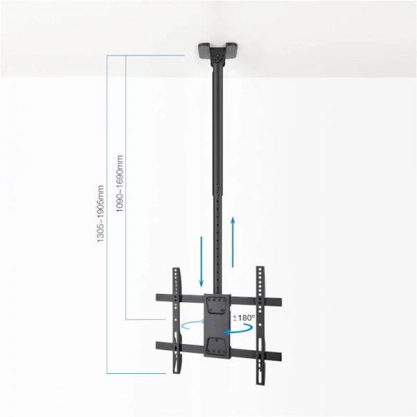 | Características | - Pantallas soportadas: 32'-75' - Compatible con VESA: Máximo 400 x 400. Mínimo 200 x 200 - Peso máximo soportado de pantalla: 60 kg - Ángulo de inclinación: +0°/-25° - Ángulo de giro: +180°/-180° - Ángulo de nivelación: +3°/-3° - Distancia de techo: 1090-1690 mm - Apto para techos inclinados: +60°/-60° - Sistema de organización de cables - Compatible con pantallas curvas - Color: Negro - Material: fabricado en acero de alta calidad - Peso: 5,75 kg. - Medidas del embalaje: 937 x 254 x 168 mm Contenido del Paquete - 1 x Soporte - 1 x Kit montaje (incluye herramientas) - 1 x Manual de instalación |