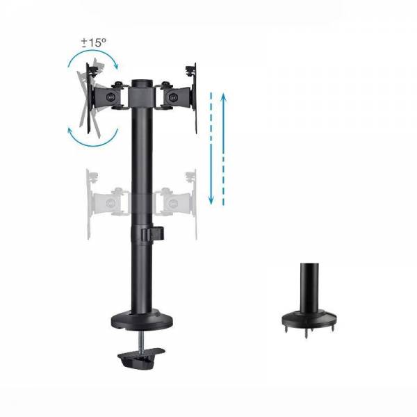 | Características | - Permite instalar 2 pantallas - Pantallas soportadas: 17'-32' - Compatible con VESA: 75x75 y 100 x 100 - Peso máximo soportado de pantalla: 8 kg por brazo - Ángulo de inclinación: +15°/-15° - Ángulo de giro: +15°/-15° - Ángulo de rotación: +180°/-180° - Altura del bastidor: 399 mm - Diámetro del bastidor: 35 mm - Instalación mediante tornillo pasante (con opción a atornillar la base para mayor seguridad) - Rango de grosor de la superficie: 10-75 mm - Sistema de sujeción de cables - Color: Negro - Material: fabricado en acero de alta calidad - Peso: 2,15 kg. - Medidas del embalaje: 440 x 210 x 75 mm Contenido del Paquete - 1 x Soporte - 1 x Kit montaje (incluye herramientas) - 1 x Manual de instalación |