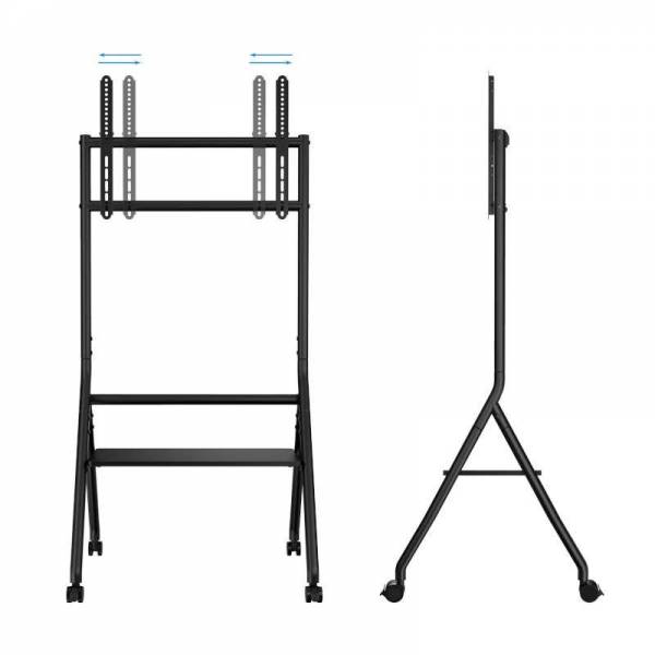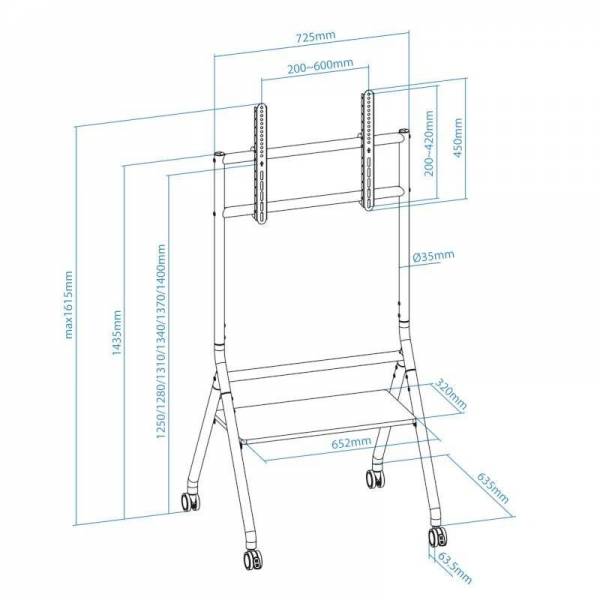 | Características | - Pantallas soportadas: 37'-86' - Compatible con VESA: Máximo 600x400. Mínimo 200x200 - Sistema de organización de cables - Material: Estructura de acero y tablero de MDF - Peso soportado de pantalla: 80 kg - Rango de ajuste de altura del soporte: 1465-1615 mm - Ancho del soporte: 725 mm - Bandeja inferior multiusos - Medida de bandejas Inferior 652x320 mm - Peso máximo de la bandeja: 10 Kg - Distancia entre ruedas: 725x635 mm - Ruedas con sistema de bloqueo - Ruedas de 63.5 mm - Peso neto: 12,40 kg |