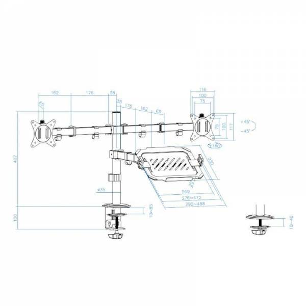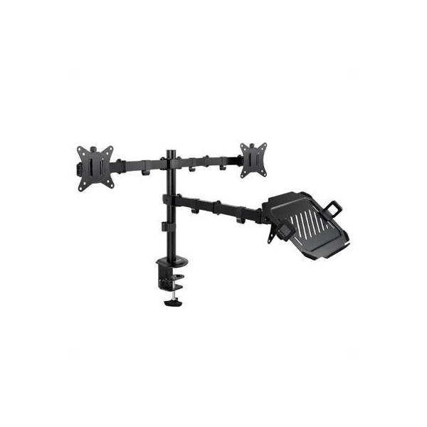 | Características | - Permite instalar 2 pantallas y 1 portátil - Pantallas soportadas: 17'-32' - Compatible con VESA: 75x75 y 100x100 - Peso máximo soportado de pantalla: 9 kg por brazo - Ángulo de inclinación: +45°/-45° - Ángulo de giro: +90°/-90° - Ángulo de rotación: +180°/-180° - Altura del bastidor: 407 mm - Diámetro del bastidor: 35 mm - Extensión máxima del brazo: 376 mm - Válido para portátiles de 12”-17” - Peso máximo soportado de portátil: 9 kg - La bandeja para el portátil - Garras de ajuste de ancho con almohadillas de protección - Instalación mediante abrazadera o tornillo pasante - Sistema de sujeción de cables - Material: fabricado en acero de alta calidad Dimensiones y peso - 460 x 315 x 36 mm - 5,40 kg Contenido - 1 x Soporte - 1 x Kit montaje (incluye herramientas) - 1 x Manual de instalación |