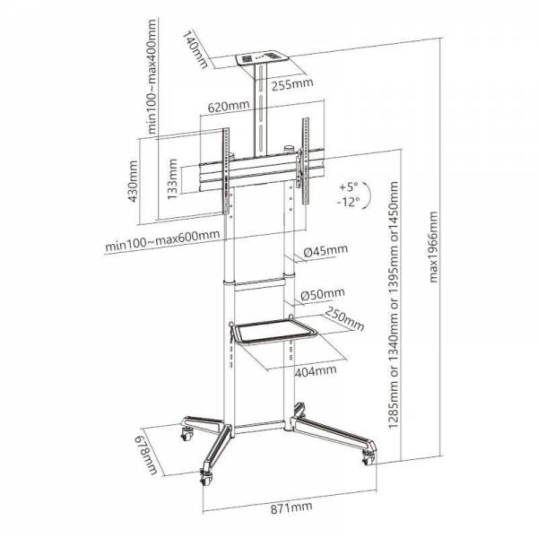 | Características | - Material: acero, plástico - Tamaño de pantalla compatible: 37'-70' - Compatible con VESA: 100x100,200x100,200x200,300x200,400x200,300x300,400x300,400x400,600x400 - Capacidad de peso del televisor: 50 kg - Cantidad de pantalla: 1 - Altura del televisor ajustable - Rango de altura: 1285 o 1340 o 1395 o 1450 mm - Capacidad de peso del estante: 5 kg - Gestión de cables Dimensiones - 871 x 678 x 1966 mm |