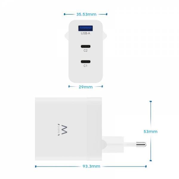 | Características | - Voltaje de entrada: 100-240 V ~ 50/60 Hz, 2,0 A máx. - Salida: C 1: 5,0 V 3 A, 9,0 V 3 A, 12,0 V 3 A, 15,0 V 3 A, 20,0 V 3,25 A (65,0 W máx.) C 2: 5,0 V 3 A, 9,0 V 3 A, 12,0 V 3 A, 15,0 V 3 A, 20,0 V 3,25 A (65,0 W máx.) - USB-A: 3,6 V-6,0 V 3,0 A, 5,0 V 4,5 A, 6,0 V-9,0 V 2,0 A, 9,0 V/12,0 V 1,5 A (22,5 W máx.) - C1+C2: 45,0 WPD+20,0 WPD (65,0 W máx.) - C1+USB-A: 45,0 WPD+22,5 W (67,5 W máx.) - C2+USB-A: 5,0 V 4,5 A (22,5 W máx.) - C1+C2+USB-A: 45,0 WPD+22,5 W (67,5 W máx.) - Total: 65,0W - Dimensiones: 109,3 mm x 37,8 mm x 33,8 mm |