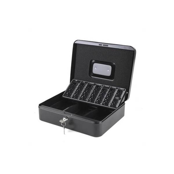 | Características | - Caja de efectivo para monedas y billetes - Asa superior - Cerradura frontal de dos posiciones (abierto o cerrado) - Apertura manual con llave (incluye juego de 2 llaves) - Compartimentos: 3 billetes y 8 monedas - Bandeja extraíble con separadores para 8 tamaños de monedas: 2€ - hasta 70€ (35 monedas) 1€ - hasta 35€ (35 monedas) 50 céntimos - hasta 17,50€ (35 monedas) 20 céntimos - hasta 8€ (40 monedas) 10 céntimos - hasta 4€ (40 monedas) 5 céntimos - hasta 2,50€ (50 monedas) 2 céntimos - hasta 40 céntimos (20 monedas) 1 céntimo - hasta 20 céntimos (20 monedas) - Bandeja extraíble para 3 billetes (17 alto x 8,5 ancho cm) - Medidas: 300 ancho x 240 profundo x 90 alto mm - Material: caja de acero, bandeja para billetes de ABS y compartimento para billetes de PVC - Peso: 1,77 kg - Color: negro |