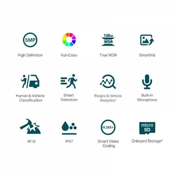 | Características | Red - Protocolo: TCP/IP, UDP, ICMP, HTTP, HTTPS, DHCP, DNS, RTSP, NTP, UPnP UDP, SSL/TLS - ONVIF - API: Interfaz de vídeo en red abierta (perfil S) - Vista en vivo simultánea 3 transmisiones principales y 3 subtransmisiones - Client: VIGI App, VIGI Security Manager, Web UI - Navegador web: Navegador web Google Chrome 57 y superior Firefox 52 y superior Safari 11 y superior Microsoft Edge 91 y superior - Nube - Seguridad: Protección con contraseña, cifrado HTTPS, filtro de dirección IP, autenticación implícita Audio - Entrada de audio - Compresión de audio - Frecuencia de muestreo de audio : 8KHz - Filtrado de ruido ambiental - Velocidad de bits de audio: 64 Kbps (ley G.711) Alarma - Clasificación inteligente de personas y vehículos de eventos - Detección de intrusión de área Detección de cruce de líneas Detección de personas Detección de vehículos Detección de entrada de región Detección de salida de región Detección de objetos abandonados Detección de eliminación de objetos Detección de merodeo Detección de cambios de escena - Detección básica: Detección de movimiento Detección de manipulación de vídeo Excepción (inicio de sesión ilegal) Detección de cambio de escena - Enlace de alarma: Grabación de vídeo con tarjeta de memoria, mensaje push, luz blanca intermitente - Notificación de salida: Mensaje push Alimentación - Fuente de alimentación: 12V DC ± 5%, Max. 9 W Enchufe de alimentación coaxial de 5,5 mm. PoE: 802.3af/at, clase 0, máx. 8W Dimensiones y peso - Φ115 x 85,7 mm - 0.28 g Contiene - Cámara de red VIGI - Guía de inicio rápido - Accesorios para cables impermeables - Accesorios de montaje |