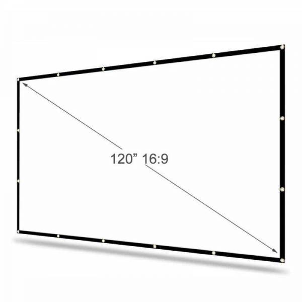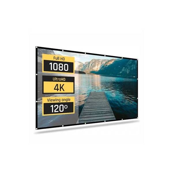 | Características | - Área visible de 120' (265 x 149 cm) - Formato: panorámico 16:9 - 16 ollaos - Factor de ganancia: 1,1 - Ángulo de visión: 120º - Ideal para proyectar vídeo y fotografías - Bordes negros perimetrales de 3 cm - Apta para interiores - Tela elástica de poliéster resistente a las arrugas, plegable y lavable - Ideal para cualquier tipo de proyector, SVGA, XGA, 3D, HD, Full HD y 4K - Temperatura de trabajo: -20ºC ~ +60ºC - Medida plegada en bolsa: 36 x 29 x 5 cm - Peso total: 900 g - Incluye 4 cuerdas de 1 metro de longitud y set de 19 colgadores |