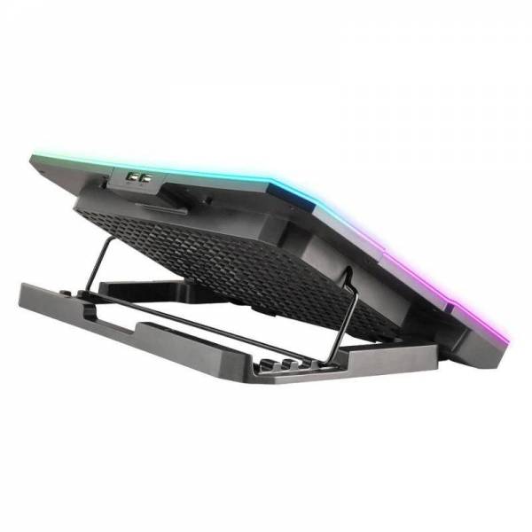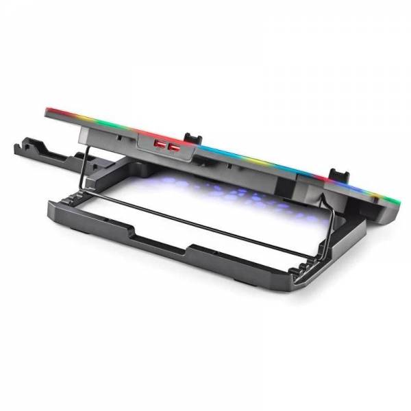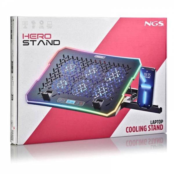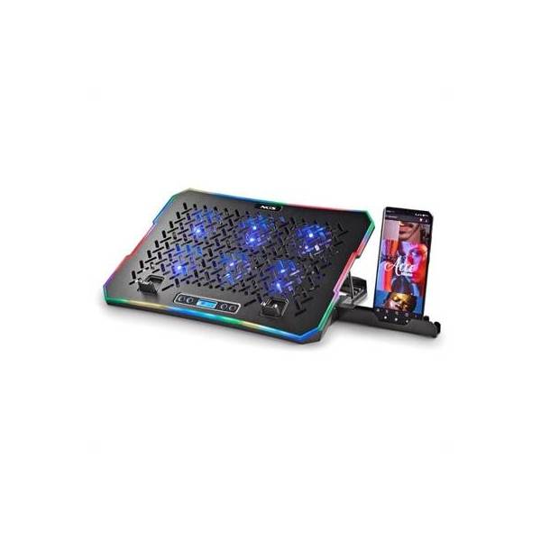 | Características | - Base de refrigeración para portátil con 6 x ventiladores de alta velocidad - 6 x ventiladores (70 x 15 mm) a 2400 rpm - Pantalla LCD - Botones velocidad del ventilador - 2 x puertos USB - Velocidad máxima de 2400 rpm - Con rejilla metálica - Tiras de iluminación ambiental RGB integradas (10 modos de iluminación) - 4 x configuraciones de altura - Soporte integrado para el smatphone Dimensiones - 360 x 260 x 31 mm |