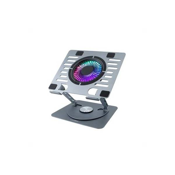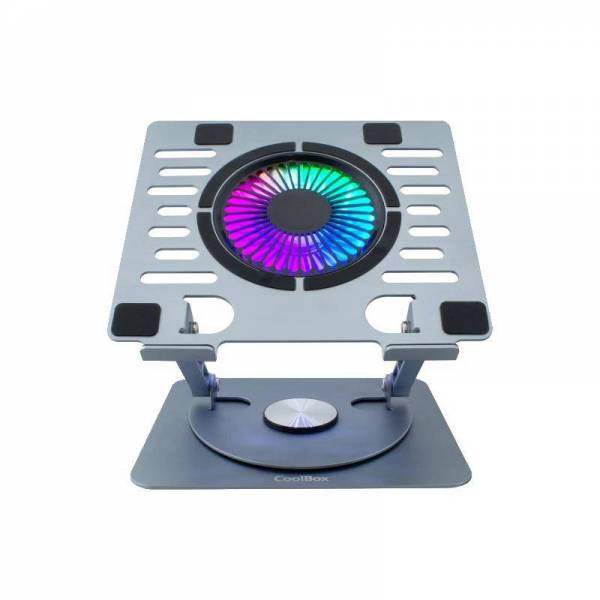 | Características | - Compatibilidad: Para portátiles de hasta 17” - Refrigeración: 1 ventilador con regulador de velocidad - Hub integrado: doble puerto USB 2.0 - Iluminación: Ventilador RGB con botón de ajustes - Material: Aluminio - Posiciones: Rotación ajustable 360º y ángulo completamente ajustable. - Flujo de aire: 38 CFM - Potencia: 2W - Ruido: 28dB - Botones: Rueda de control de velocidad del ventilador y botón de control de iluminación RGB. Dimensiones - 110 x 110 x 15 mm |