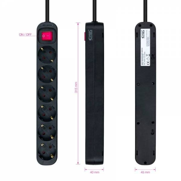 | Características | - 6 tomas de corriente con toma de tierra - Protección infantil - Voltaje: 250V-50Hz - Máximo 3.680W - Certificado CE, ROSH, GS y REACH - Color: Negro - Medidas del producto: 315x40x45 mm |