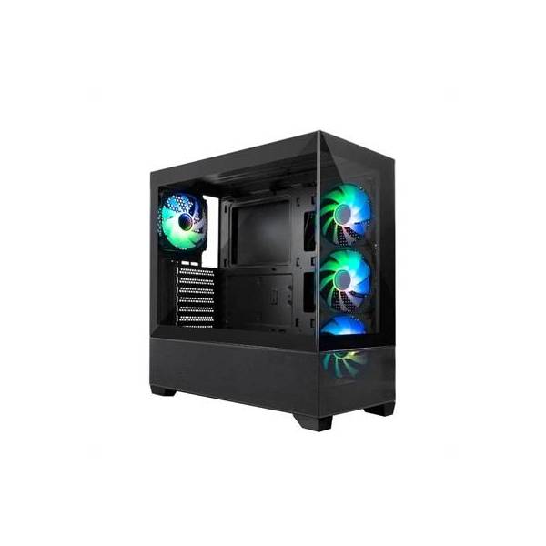 Caja para PC Gaming con cristal templado panorámico frontal y lateral. Incluye 4 ventiladores ARGB Infinity de 12 cm (1 trasero + 3 en el lateral) y es compatible con kits de refrigeración líquida de 120 mm (en la parte posterior) o 240mm/360mm (en la parte superior).