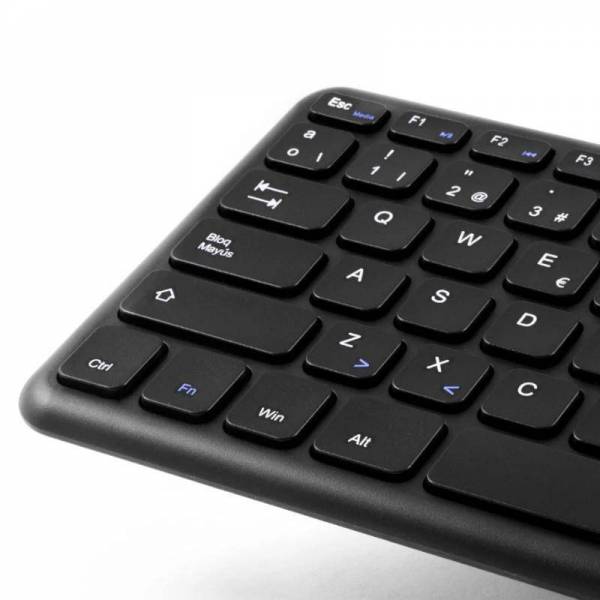 | Características | - Material: ABS - Conexión: Inalámbrica 2.4GHz, con mini-receptor USB incluido - Alcance inalámbrico: < 10m - Alimentación: 2 pilas AAA (no incluidas) - Vida útil: 3 millones de pulsaciones - Indicadores led: Bloqueo de mayúsculas, bloqueo numérico y estado de la batería - Requisitos hardware: Ordenador o dispositivo compatible con puerto USB libre - Dimensiones: 366,54 x 121,33 x 18,36 mm - Peso: 265 g (sin pilas) Teclado - 78 teclas tipo chiclet (12 de ellas multimedia) - Funciones multimedia - Función de bloqueo del touchpad (Fn + Ctrl derecho) Touchpad - Multitáctil - Tamaño: 89,6 x 74,6 mm - 2 botones integrados Contenido - Teclado - mini-receptor USB - manual de usuario |